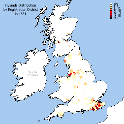 From the beginning of my research I sought to establish any link between the Hylands of Sussex and Kent and the Hylands of Ireland as well identifying any link to Scotland. For more detail see my profile page at The Guild of One Name Studies